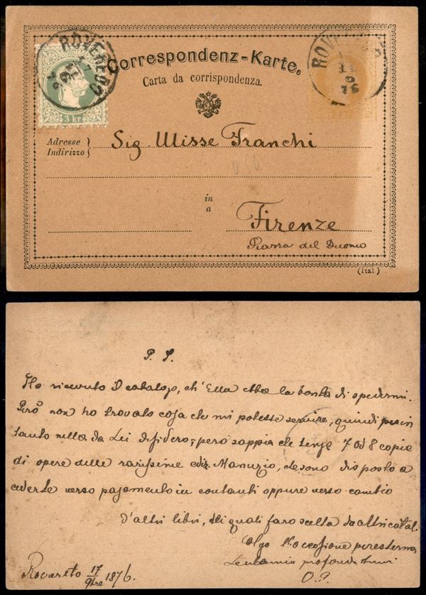 Cartolina postale da 2 kreuzer con complementare (36) da Rovereto a Firenze del 17.11.76