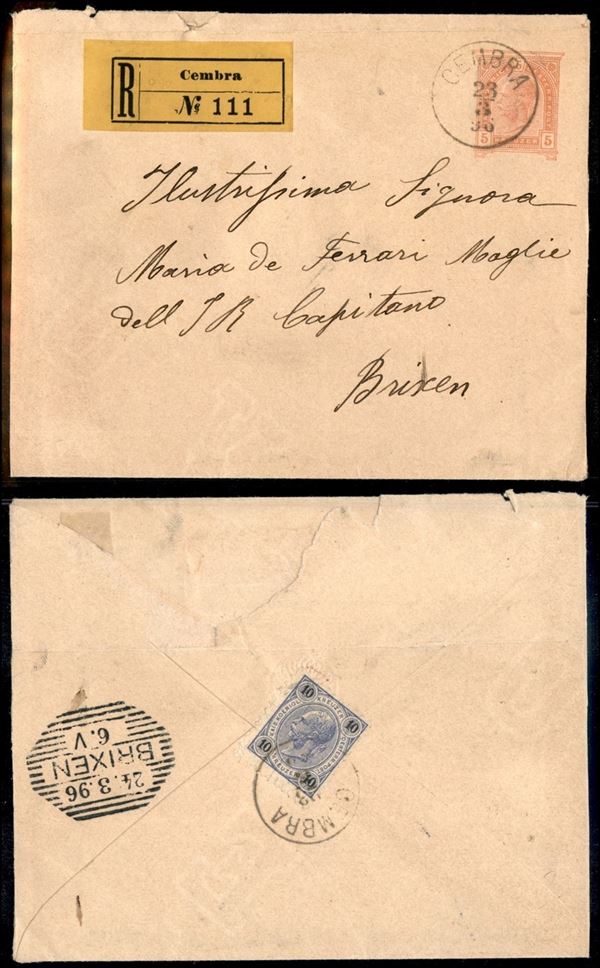 Cembra - busta postale da 5 kreuzer raccomandata per Bressanone col 10 kreuzer (54) al retro