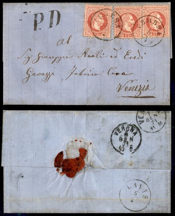 Cembra 5/1 – piego affrancato con tre 5 kr per Venezia del 5.1.71 (Unif. 34) – piega orizzontale in alto