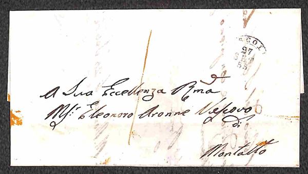 Coppia orizzontale del Mezzo bai celeste grigio (1a) - usata come tassa al retro di letterina da Ascoli a Montalto del 27.9.55
