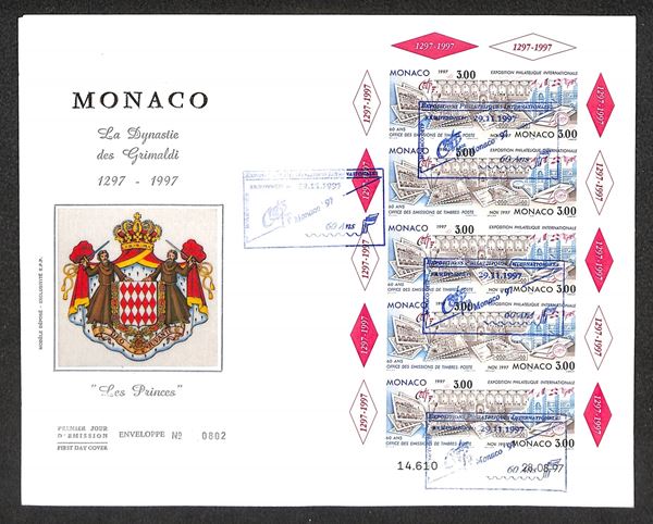 FDC Esposizione Filatelica Internazionale n. 802 Monaco 1997 – busta commemorativa con foglietto di 10 esemplari 3,00 franchi (Unif. 2141/2142) non dentellato – annullo a cartella – giorno d'emissione 29.11.1997