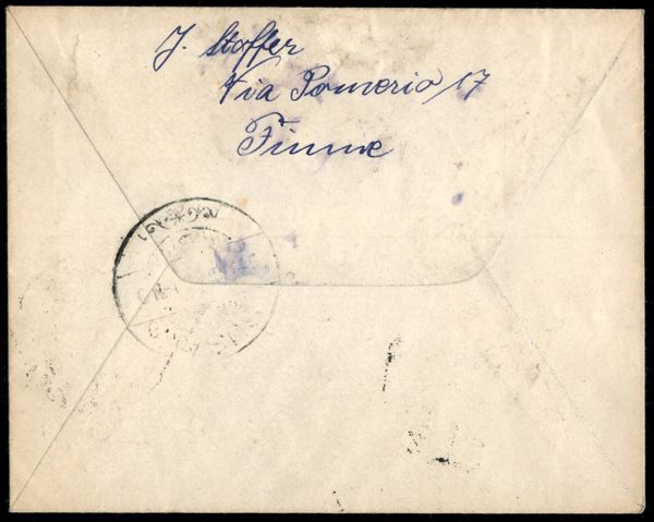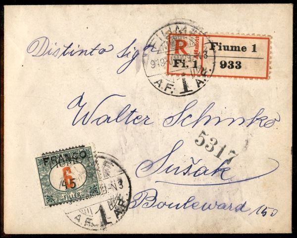 Franco 45 su 6 filler (29cbb varietà f) - sbarrette a cavallo (disallineate) + Franco/Fiume in alto - bustina raccomandata per Susak del 29.1.19
