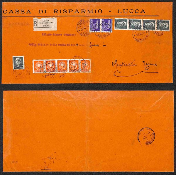 Imperiale - 2 cent (242A - striscia di 5 con piega) + 15 cent (246 - singolo + striscia di 4) + 3.70 lire (256A - coppia) - raccomandata da Lucca a Montecatini del 26.6.31