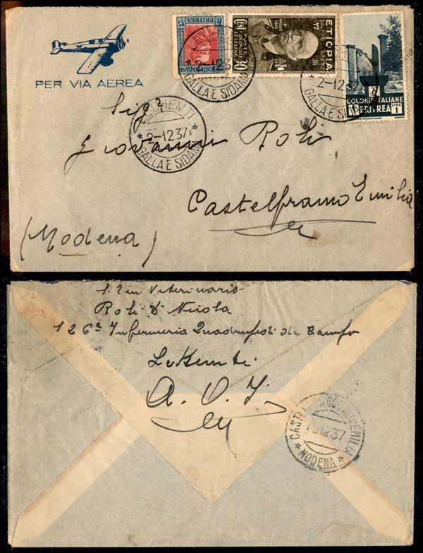 Lechenti Galla e Sidama (P.ti 10) - 30 cent (4) + Eritrea (196 + 209) - aerogramma per Castelfranco del 2.12.37