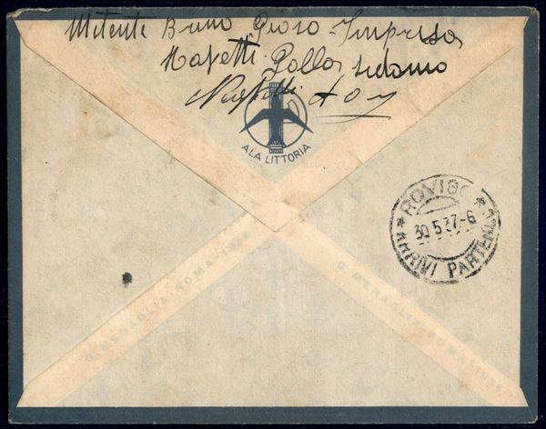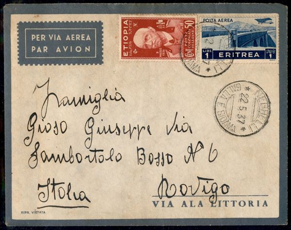 Neghelli Galla e Sidama (P.ti 10) - aerogramma per Rovigo del 22.5.37 (Eritrea 21 Aerea + Etiopia 5)