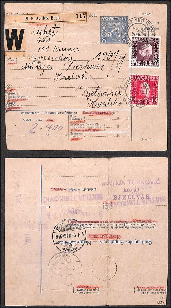 Occupazione Austriaca - Bollettino Pacchi da 8 heller + complementari Austria (69+78) da KK Milit. Post/Bos. Brod a Bjelovarn del 5.9.16