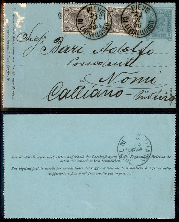 Pieve di Livinallongo - intero postale da 3 kreuzer con complementari (50+50) per Nomi del 21.8.96