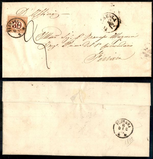 Polesella 5/12(1872) - lettera d'ufficio per Ferrara tassata in arrivo per 30 cent (7-segnatasse)