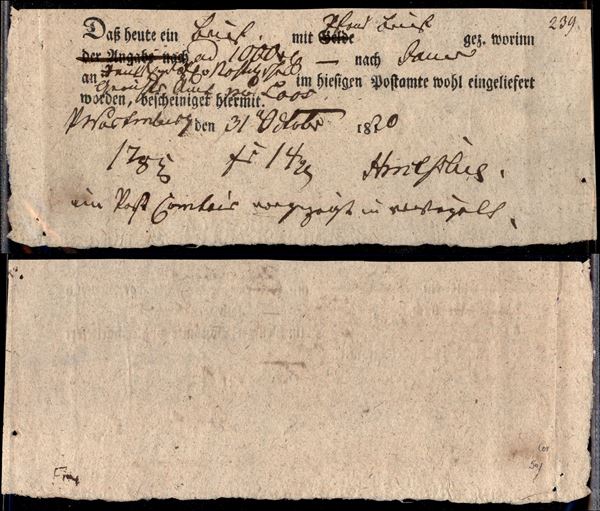 (Prussia) - Wartemberg 31.10.1820 - ricevuta di lettera assicurata