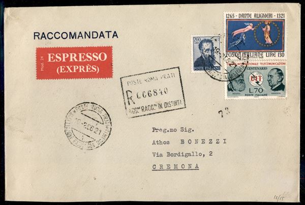 Raccomandata espresso con affrancatura multipla composta da 200 lire Michelangiolesca (915) + 130 lire Dante Alighieri (1006) + 70 lire UIT (996) da Roma 19.2.66 per Cremona
