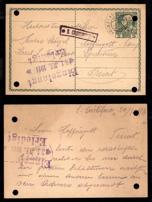 S. Cristoforo (P.ti 6) - cartolina postale per Trento del 29.7.11 - fori di registro