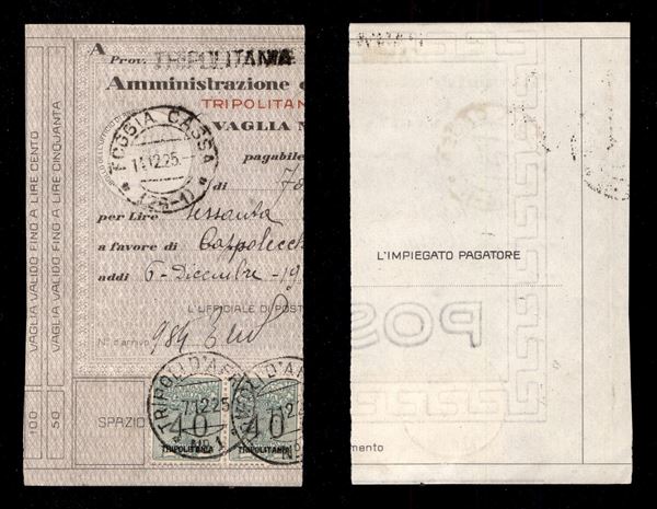 Segnatasse Vaglia - 40 cent (2) - coppia su ricevuta Vaglia da Tripoli N.1 del 7.12.25