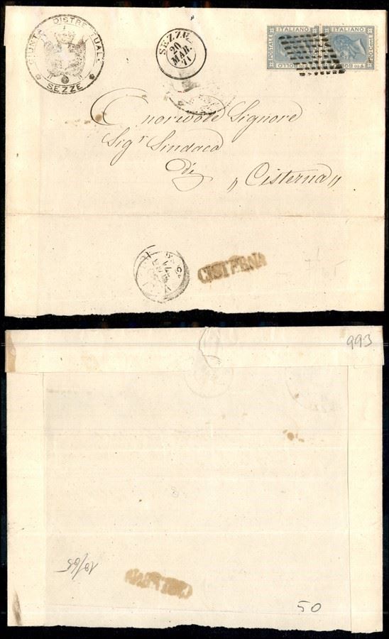 Sezze (pti 6) - coppia del 20 cent (26-Regno) su frontespizio con parte del retro di lettera per Cisterna (rossastro al retro) del 20.3.71 - un pezzo difettoso