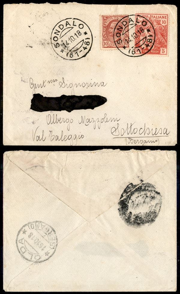 Sondalo (61-48) 14.10.18 - 10 cent Leoni (82) + 10 cent Croce Rossa (102) - su busta per Bergamo - indirizzo cancellato