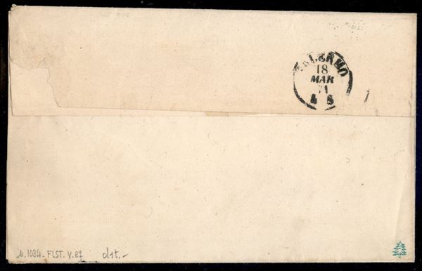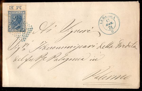 Sopracoperta di lettera affrancata con 20 cent (T26) da Lercara 17 mar. 71 annullato con numerale a punti 1246 entrambi in azzurro per Palermo - ex coll. Provera