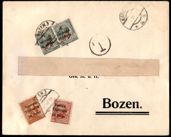 Tre valori (131 + 132 + 135 coppia) su busta da Kardaun a Bolzano del 3.4.19