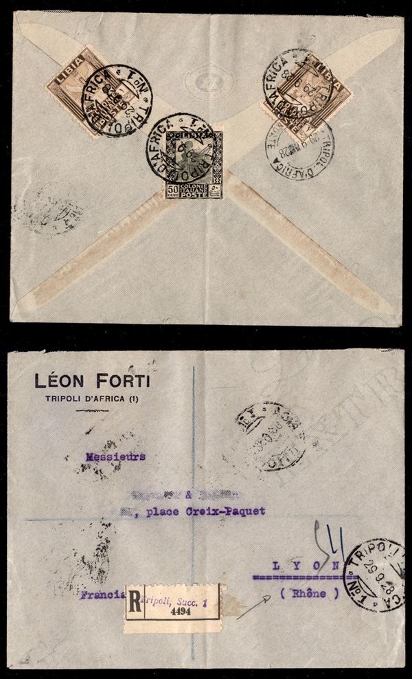 Tripoli d’Africa N.1 29.9.28 - raccomandata affrancata al retro (64 + 65 + 65) per Lione - piega centrale