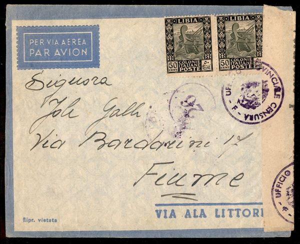 Ufficio Provinciale Censura - unico annullatore su coppia del 50 cent (51) - aerogramma per Firenze del 16.7.1941