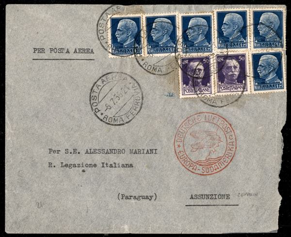 Zeppelin - Aerogramma affrancato con Imperiale due 50 cent + sei 1,25 lire (251 + 253) da Roma Posta Aerea 6.7.36 per Assunzione (Paraguay)