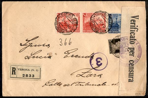 1,25 lire azzurro + coppia 20 cent carminio Ferrovie + 10 cent bruno Imperiale (245 + 449 + 451) su raccomandata da Verona 3.10.40 per Zara con bolli e fascette di censura