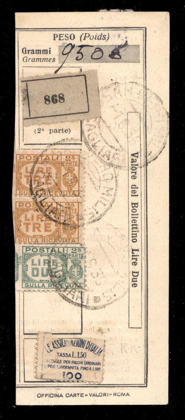 1,50 lire (9 - madre) difettoso su ricevuta di Bollettino da Cagliari del 1.6.36