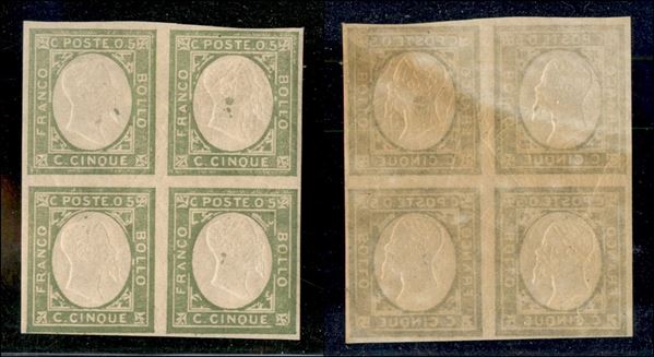 1861 - Province Napoletane - Non Emessi - 5 cent (1 - verde oliva) in quartina - gomma integra (240+)