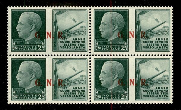 1943 - 25 cent Esercito (14/I) in quartina (pos. 81/87) - punto piccolo dopo G (14/IIed) nella coppia superiore - gomma integra