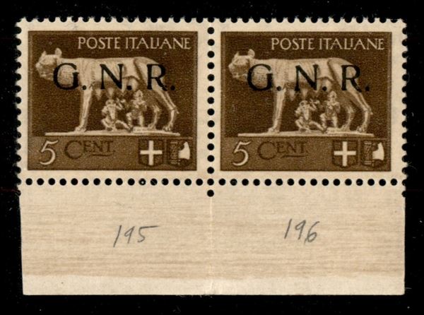 1943 - 5 cent (470/I) - coppia bordo foglio con filigrana lettere 12/10 - gomma integra