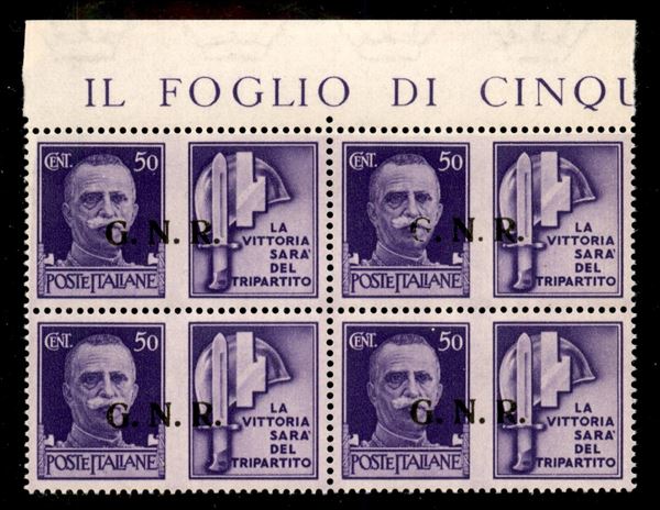 1943 - 50 cent Milizia (24/I tre + 24/Iee) in quartina bordo foglio - punto piccolo dopo N in alto a destra - gomma integra