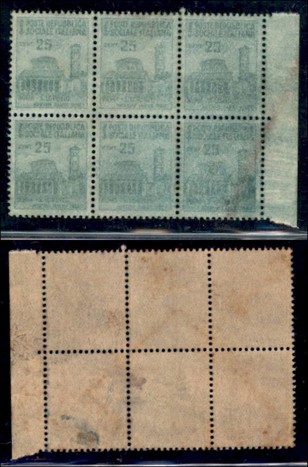 1944 - 25 cent (505b) - blocco di 6 bordo foglio con stampa evanescente (confusa) - gomma integra - macchie al retro - da esaminare