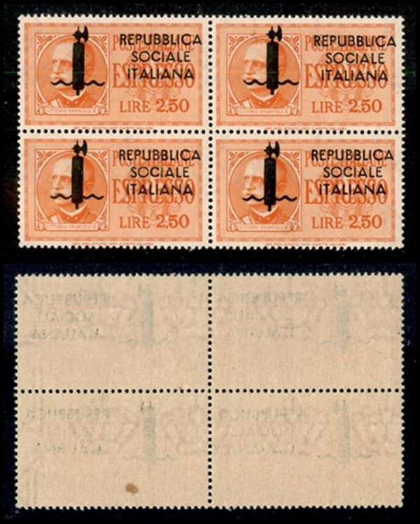 1944 - 2,50 lire (22 varietà) in quartina - soprastampa in alto a destra - gomma originale/integra in basso - un pezzo con corpo estraneo nella gomma - non catalogato