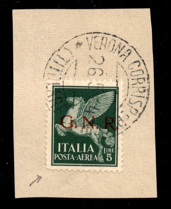 1944 - 5 lire (123) usato a Verona (Titolare) su frammento - angolo inferiore sinistro arrotondato - Oliva