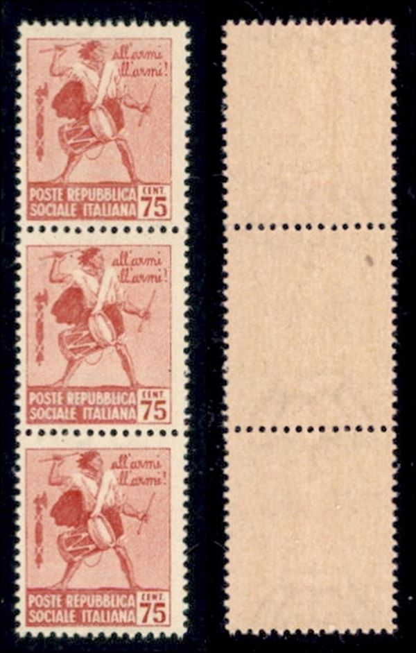 1944 - 75 cent (499c) - stampa evanescente - striscia verticale di 3 - gomma integra
