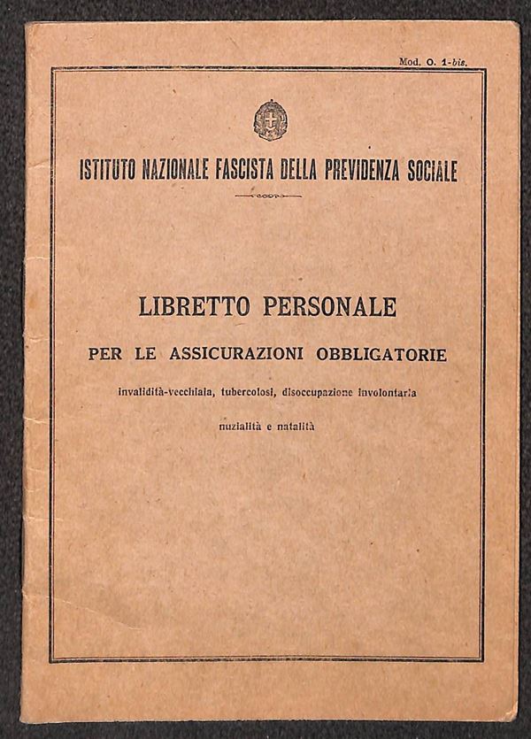 1944 - Libretto personale del Istituto Nazionale Fascista della Previdenza Sociale per le assicurazioni obbligatorie
