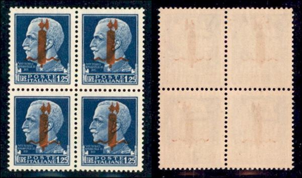 1944 - Soprastampa rosso arancio - 1,25 lire (495E) in quartina - gomma integra