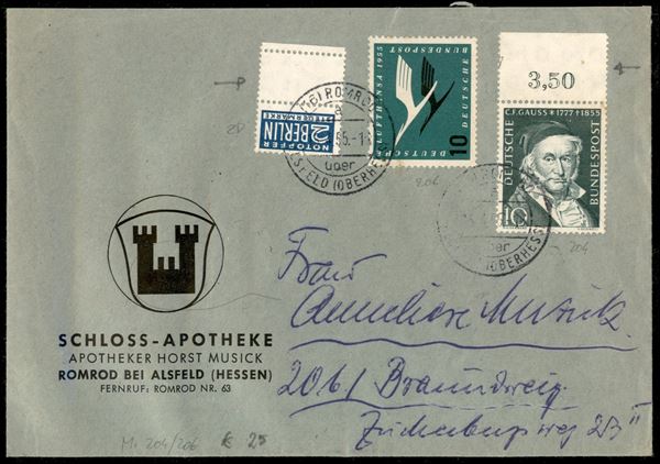 2 pfenning con interspazio (2D) + complementari (204 + 206) - busta da Romrod bei Alsfeld del 15.4.55