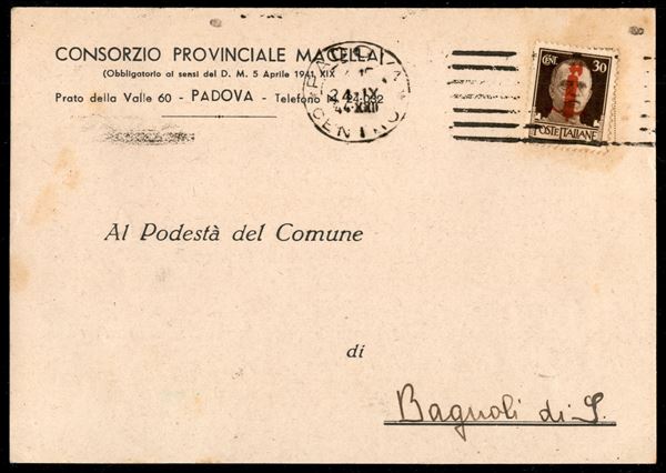 30 cent (492E) con fascio rosso arancio - cartolina da Padova a Bagnoli del 24.9.1944