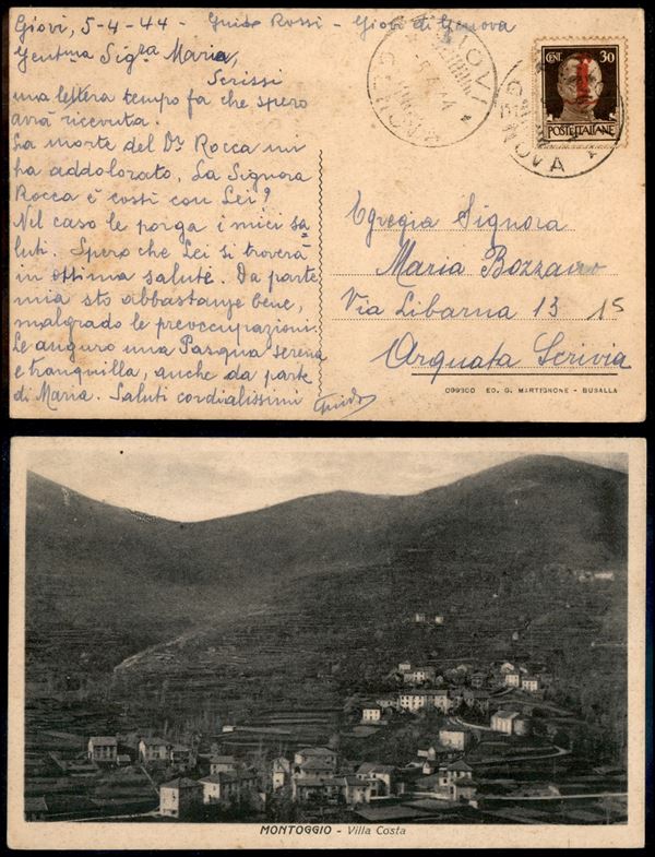 30 cent (493 - varietà) con falla di stampa alla base del fascio - cartolina (Montoggio - Villa Costa) da Giovi a Arquata del 5.4.44