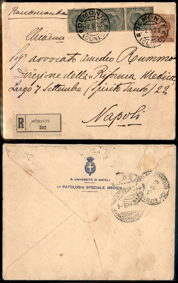 85 cent Michetti (112) + tre 5 cent Leoni (81) - raccomandata da Demonte a Napoli del 2.9.23