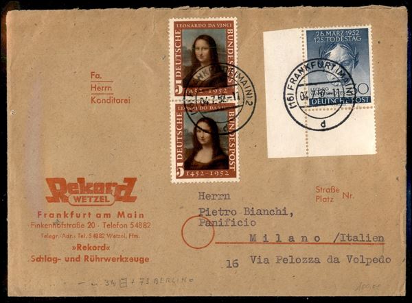Berlino + Repubblica Federale - busta da Francoforte a Milano del 4.7.52 (87 + due 148)