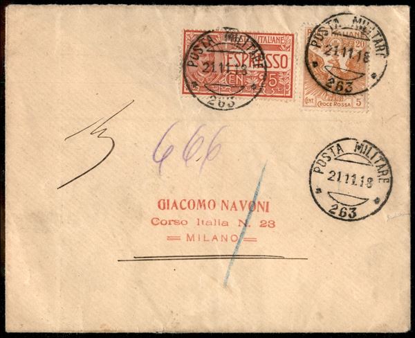 Busta affrancata con 20 pił 5 cent Croce Rossa (105) pił 25 cent Espresso (1) - Posta Militare 263 21.11.18 - ex coll. Provera