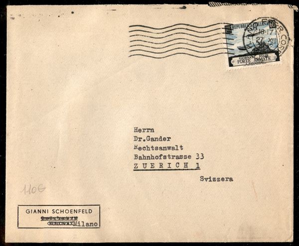 Busta affrancata con 60 lire Forze Armate (701) isolato da Milano a Zurigo del 27.12.52