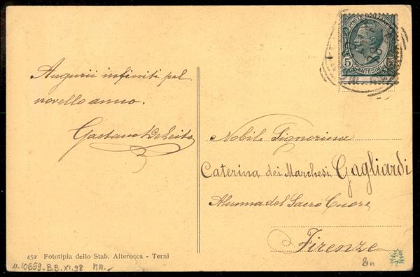 Cartolina illustrata affrancata con 5 cent Leoni (81nc) con dentellatura orizzontale spostata in basso - da Monteleone di Calabria (Vibo Valentia) a Firenze del 30.5.11 - ex coll. Provera
