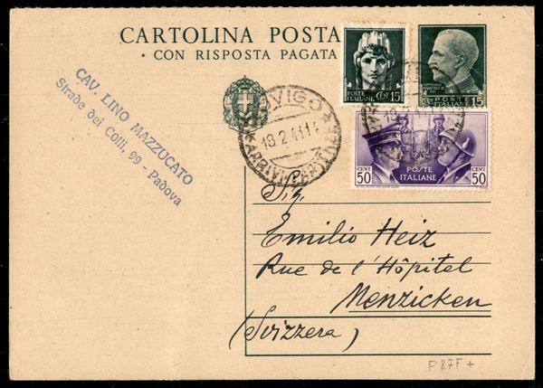 Cartolina postale con affrancatura aggiuntiva da Rovigo 18.2.41 per la Svizzera