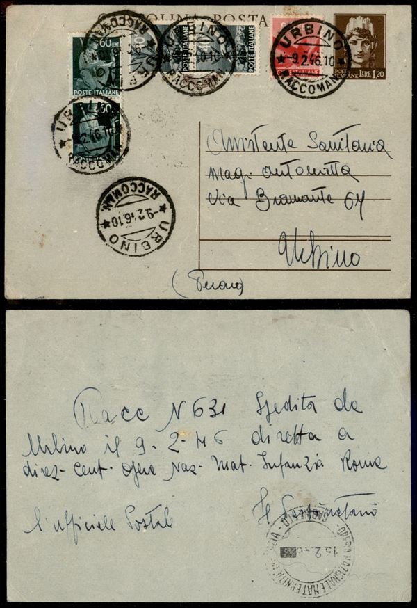 Cartolina postale da 1.20 lire (124) con affrancatura complementare multipla (546 coppia + 548 coppia + 549) raccomandata per cittą - Urbino 9.2.46