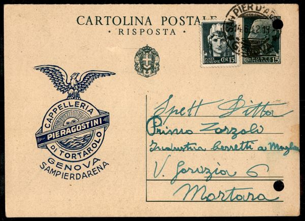 Cartolina Postale Imperiale 15 cent Risposta con pubblicità a stampa Cappelleria Pieragostini di Tortarolo affrancata con 15 cent da Sampierdarena 14.6.42 per Mortara - fori d'archivio - rara
