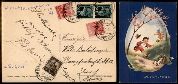 Democratica (544 + 548 coppia + 549 + 549) - cartolina da Treviso a Zurigo del 27.4.45 - un 60 cent con angolo difettoso