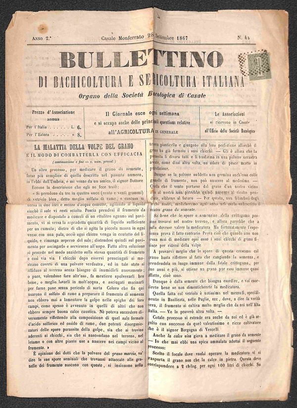 Giornale "Bollettino della bachicolutira e sericoltura italiana" del 28 sett. 1867 affrancato con 1 cent (14) annullato con numerale a punti 51 da Casale Monferrato