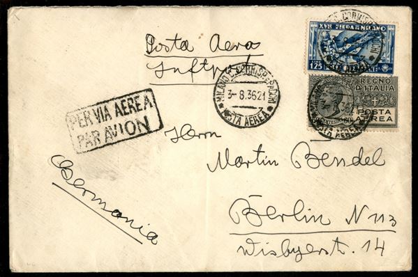 Lettera aerea per la Germania con XVII Fiera di Milano 1.25 lire + Aerea 30 cent (397 + Aerea 3) da Milano 3.8.36 per Berlino