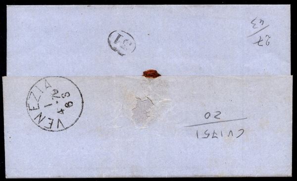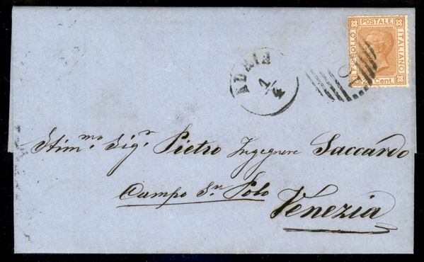 Lettera con 20 cent (28) con annullo numerale a sbarre 1001 da Adria 1/4 del 1879 a Venezia - annullo di fornitura austriaca